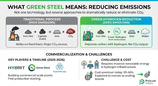 Green steel isn’t one technology. It’s several approaches to dramatically reduce or eliminate steel production emissions.
