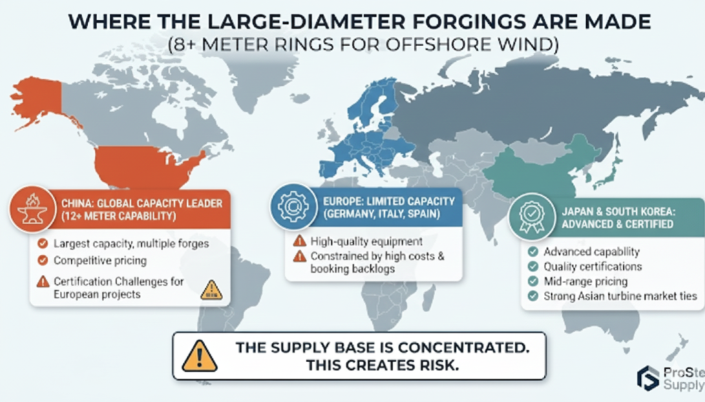 China: Largest ring rolling capacity globally. Multiple forges with 12+ meter capability. Competitive pricing but certification challenges for European wind projects.